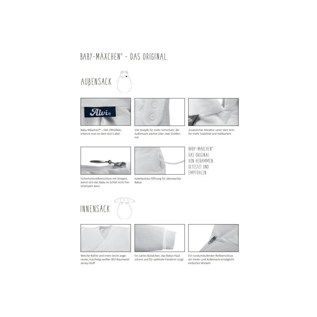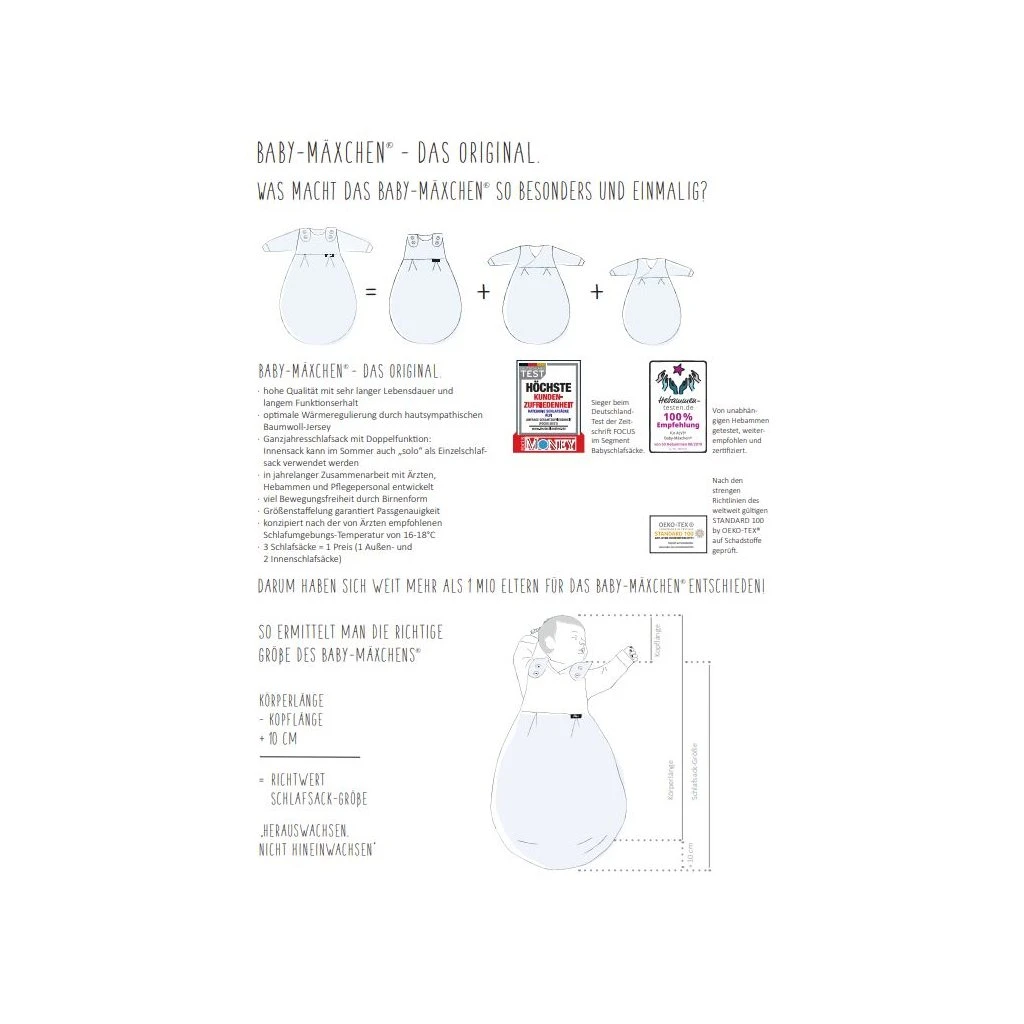 2,5 TOG-Wert Schlafsack. Bestehend aus: 1 birnenförmiger, mitwachsender Außensack mit umlaufendem Reißverschluss, 1 großer + 1 kleiner Innensack mit Ärmeln, Wickeltechnik. In heißen Sommernächten kann der Innensack auch solo benutzt werden. Viel Strampelfreiheit durch spezielle Birnenform des Innen- und Außensacks. Hals- und Armausschnitt über Knopfsystem verstellbar In jahrelanger Zusammenarbeit mit Ärzten und Pflegepersonal entwickelt. Unabhängige Hebammen haben das ALVI® Baby-Mäxchen getestet und empfehlen ihn Eltern zu 100 % weiter. Sieger beim DeutschlandTest der Zeitschrift FOCUS im Segment Babyschlafsäcke. Nach den strengen Richtlinien des weltweit gültigen OEKO-TEX Standard 100 auf Schadstoffe geprüft. Faustregel: Körperlänge – Kopflänge + 10 cm = ideale Mäxchen-Größe.