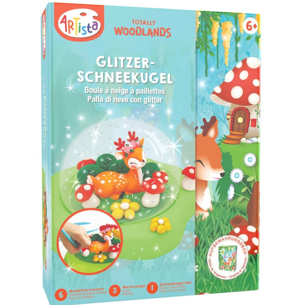 Magischer Bastelspass mit dem Totally Woodlands Set. Kinder ab 6 Jahren modellieren aus 6 verschiedenfarbigen Tonsorten die Landschaft rund um das Reh mit Hilfe der 3 Werkzeuge. Nach etwas Geschick fehlen nur noch Wasser, Glitzerstaub und schon ist das Reh in einer zauberhaften Glitzer-Schneekugel.