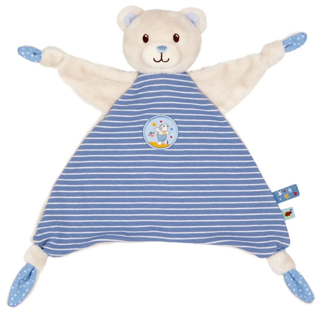 Der kleine Bär mit den blauen Streifen wird zum besten Freund und treuen Begleiter. Das kuschelweiche Schmusetuch aus der BabyGlück-Kollektion spendet Geborgenheit und Trost und lädt zum Kuscheln und Liebhaben ein. Ein ideales Geschenk zur Geburt. Wäsche bei 30 Grad.
