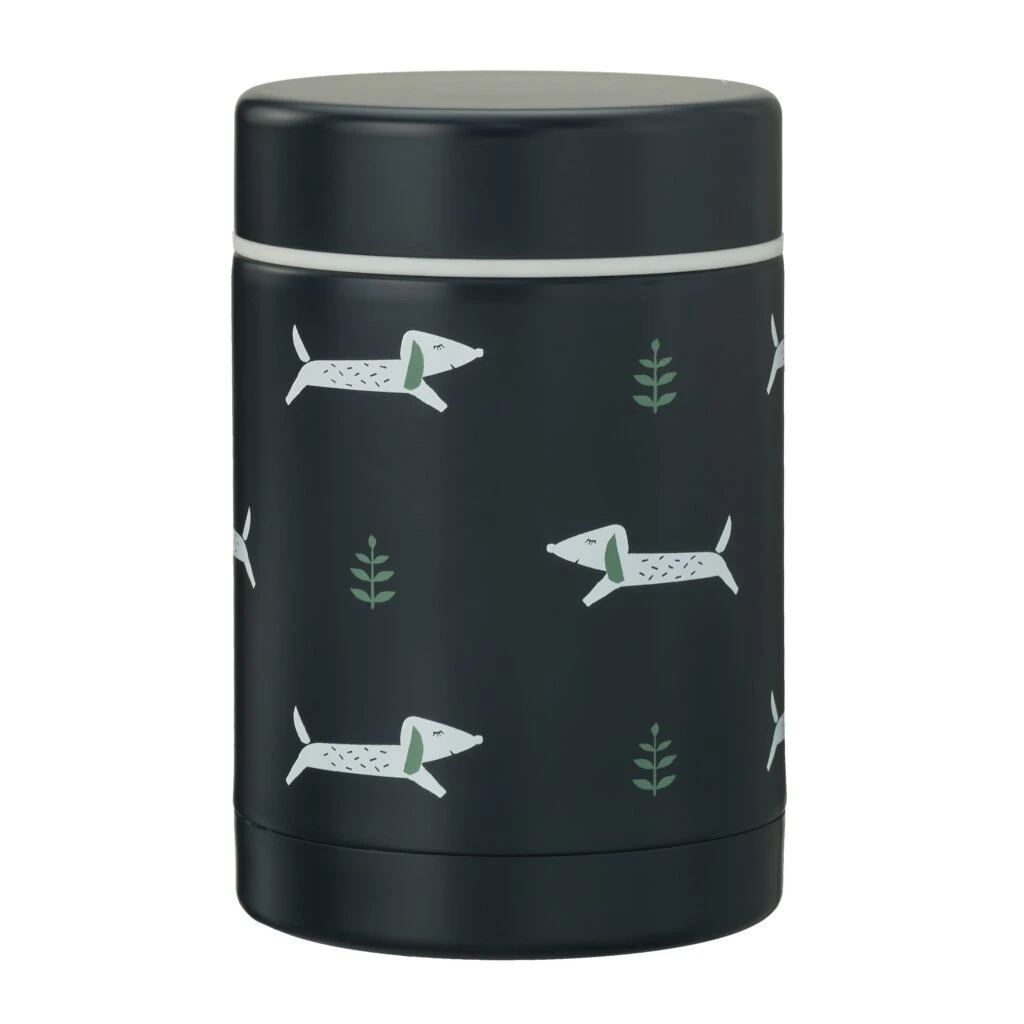 Tischlein deck dich .. es gibt Essen! Mit diesem super süßen Edelstahl Thermobehälter Dackel von der skandinavischen Firma Fresk schmeckt das Essen auch Unterwegs gleich doppelt so gut! Der praktische Behälter hält Deine Lebensmittel warm oder kalt, egal ob Brei, Suppe oder etwas anderes… der im Deckel integrierte Silikonring sorgt dafür, dass Dein Essen nicht ausläuft. Die Box ist sehr robust, bruchfest und hat ein Fassungsvermögen von 300 ml.