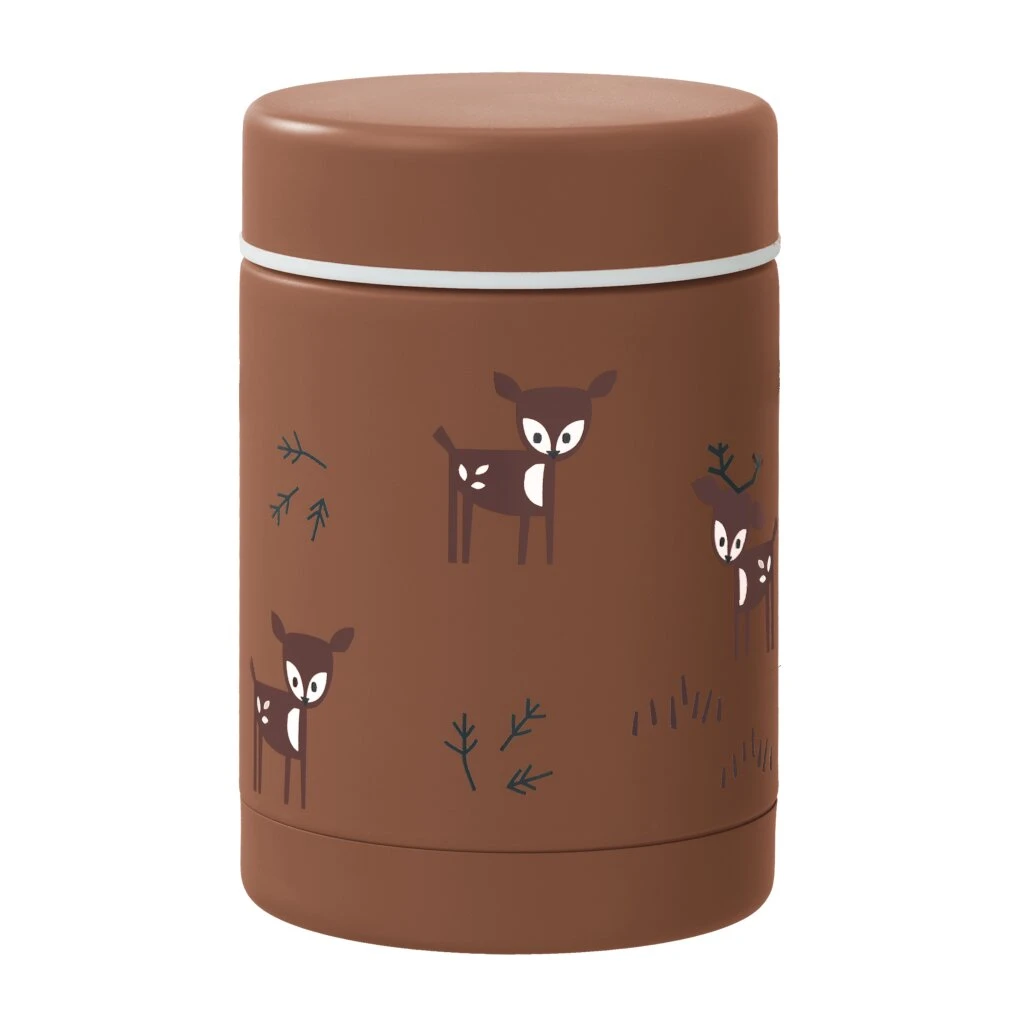 Tischlein deck dich .. es gibt Essen! Mit diesem super süßen Edelstahl Thermobehälter Hirsch braun von der skandinavischen Firma Fresk schmeckt das Essen auch Unterwegs gleich doppelt so gut! Der praktische Behälter hält Deine Lebensmittel warm oder kalt, egal ob Brei, Suppe oder etwas anderes… der im Deckel integrierte Silikonring sorgt dafür, dass Dein Essen nicht ausläuft. Die Box ist sehr robust, bruchfest und hat ein Fassungsvermögen von 300 ml.