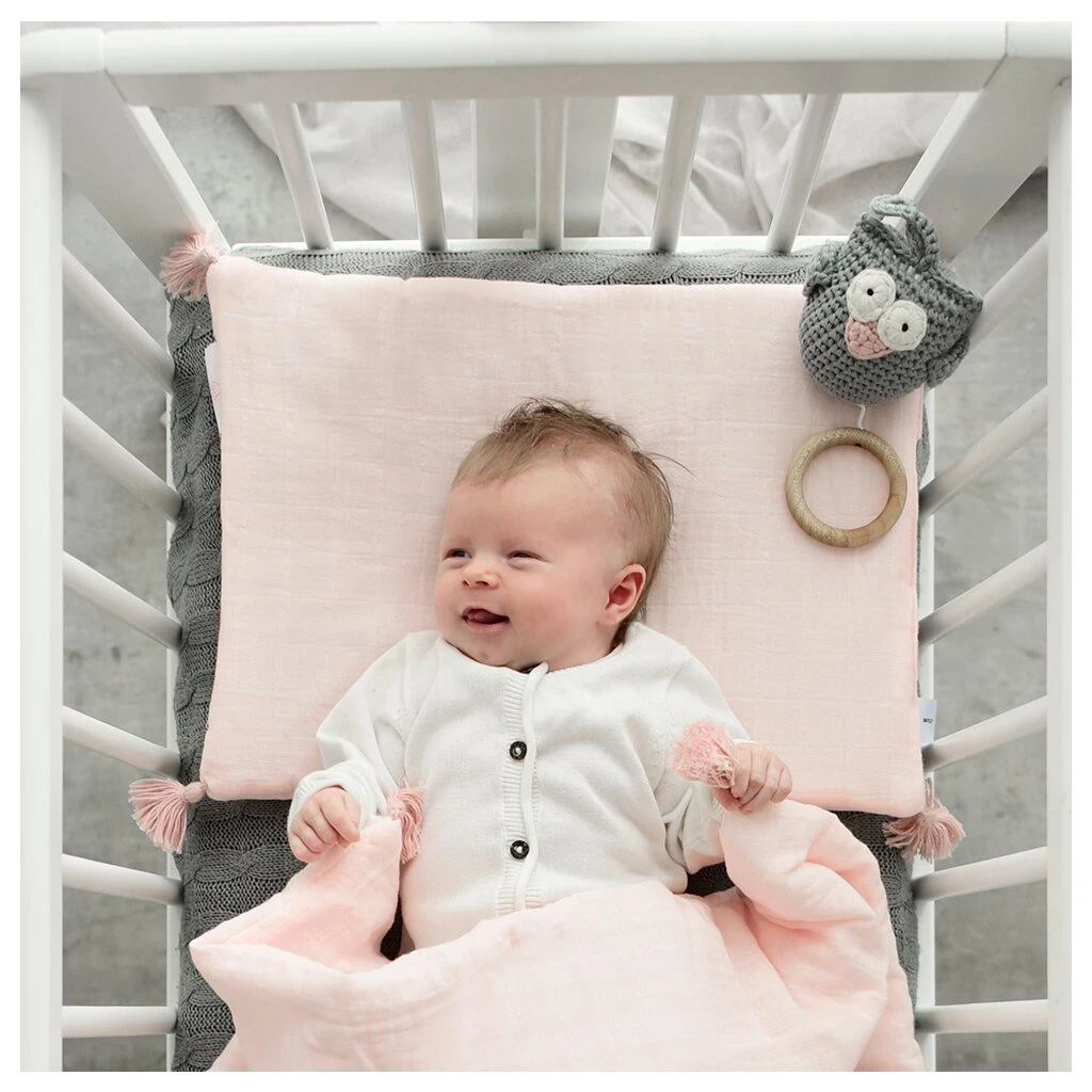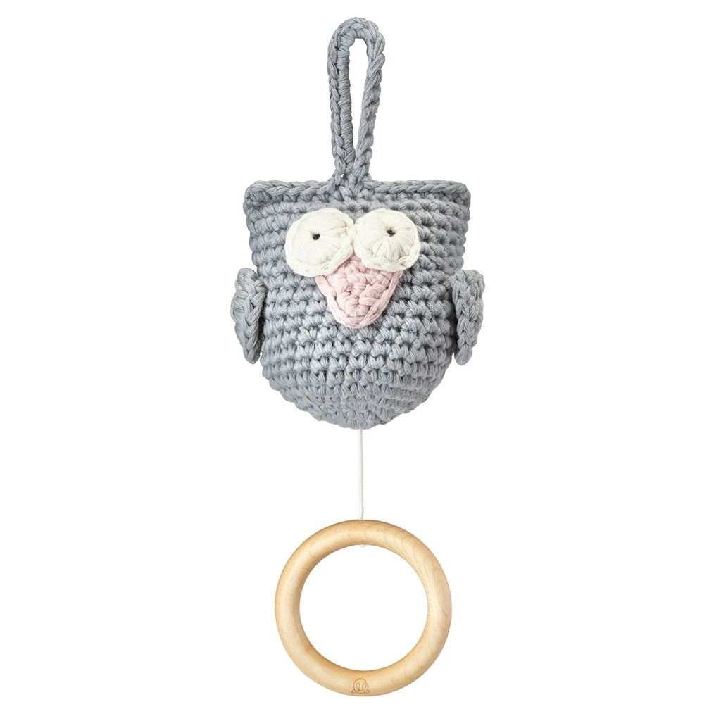 Super süße, von Hand gehäkelte Spieluhr – Eule Grau von Maylily. Die süße Eule bringt Ihren kleinen Schatz in den Schlaf.