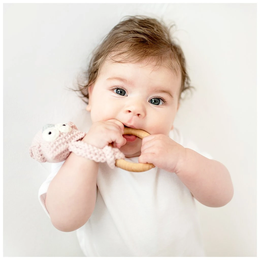 Dieser wunderschöne von Hand gehäkelte Beißring Eule in der Farbe Rosa von der Firma Maylily ist der absolute Hingucker. Der Ahornholzring hilft Deinem kleinen Schatz beim Zahnen, er wurde mit Bio- Kokosöl imprägniert.