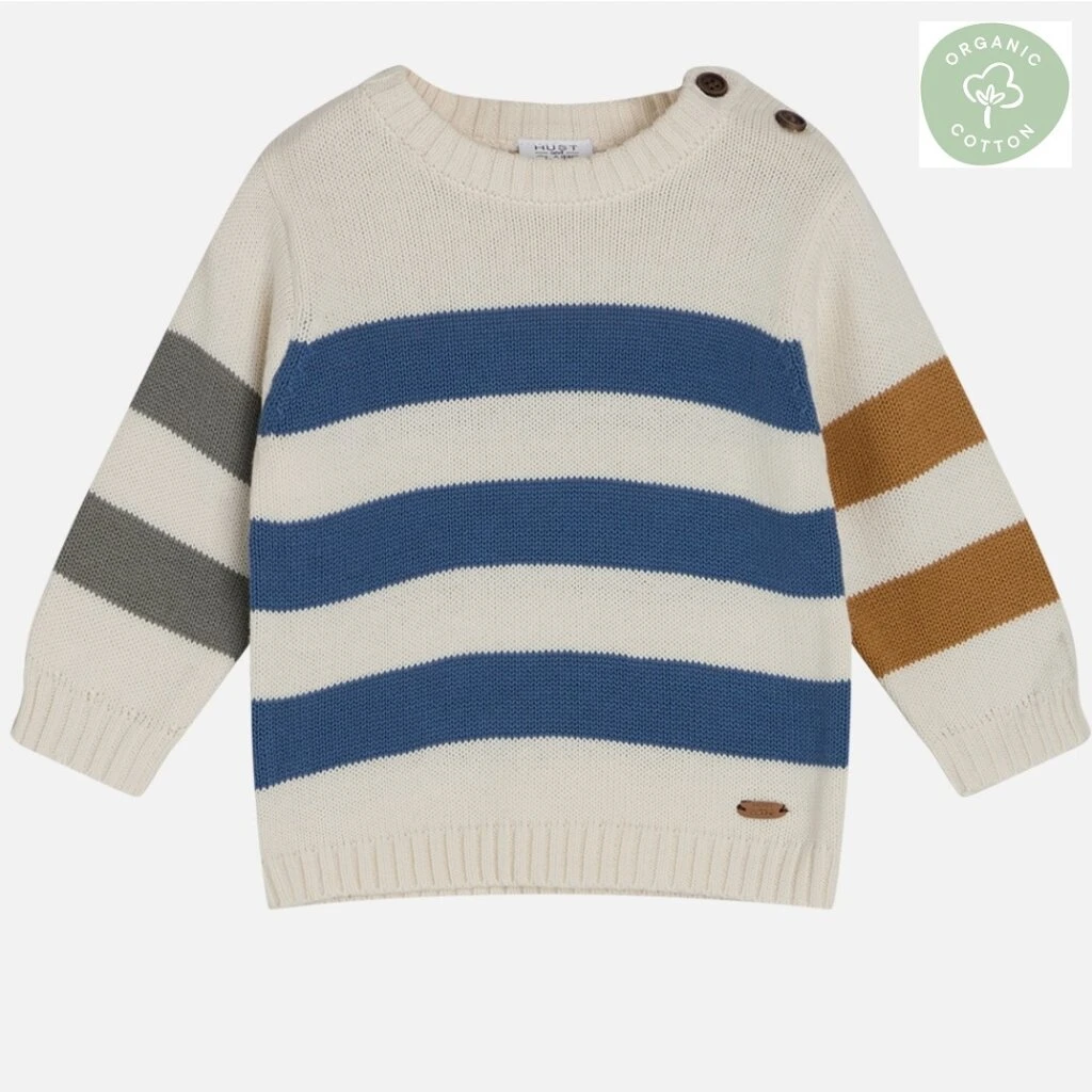 Strickpullover mit Streifen. Knöpfe auf der linken Schulter. Hergestellt aus 100 % Bio-Baumwolle.