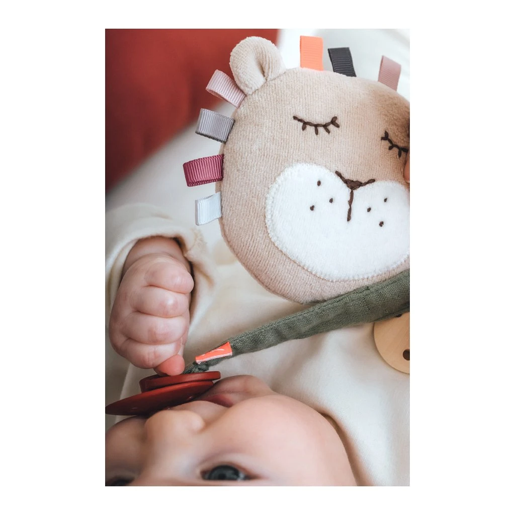 Weich und flauschig präsentiert sich der Löwengreifling. Drückt man fest darauf, quietscht er fröhlich! Die typische Löwenmähne wurde hier mit vielen verspielten, bunten Schleifen interpretiert. Ihr Baby wird es lieben, mit seinen kleinen Fingern damit zu spielen, und das praktische, so klein und handlich, dass dieses Babyspielzeug Ihr Kind überall hin begleiten kann.