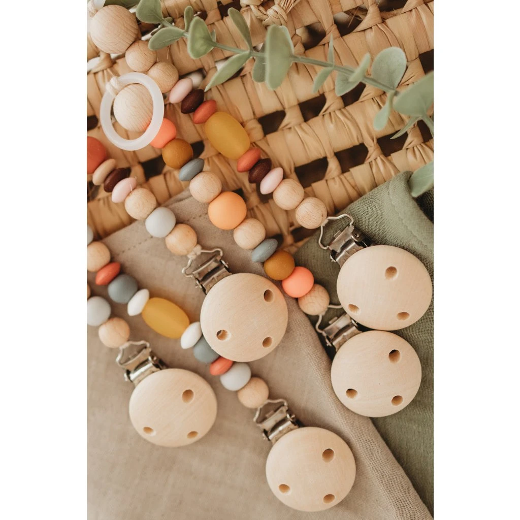 Die hübschen Schnuller-Clips bestechen durch ihr natürliches Design. Sie bestehen aus PEFC-zertifizierten Buchenholzperlen und bunten Silikonperlen in ansprechenden Farbkombinationen. Der Clip aus PEFC-zertifiziertem Ahornholz erleichtert das Anbringen der Schnullerkette.