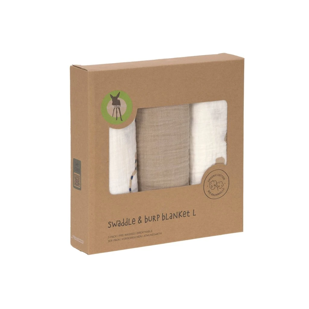 Die 85 x 85 cm großen Mulltücher aus der LÄSSIG Little Mateys Kollektion kommen im Dreierpack in schlichten Farben und verspielten Prints.
