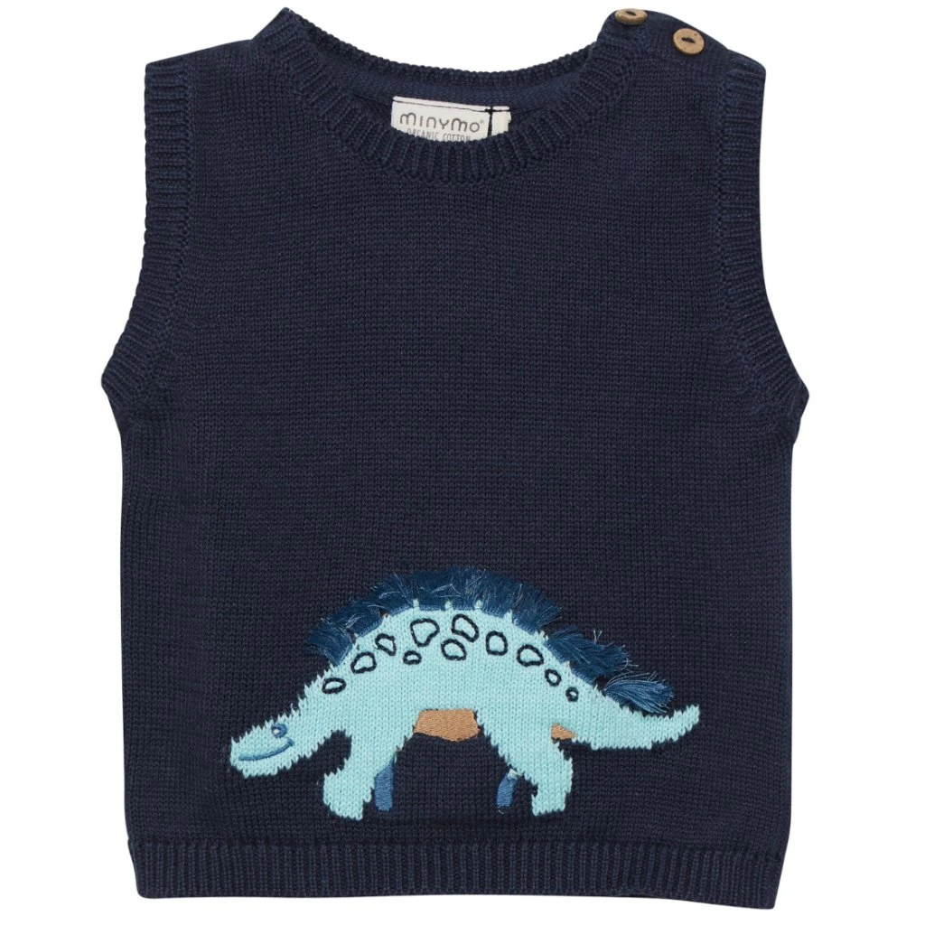 Coole Strickweste mit Dinosaurier-Print, die schön über einer Bluse oder einem Hemd getragen werden kann. Schließt mit Knöpfen an der Schulter. Die Weste ist aus reiner Baumwolle gestrickt. Zertifiziert gem. nach GOTS – Bio CERES-0366