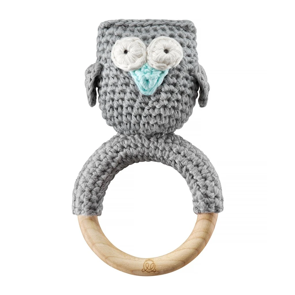 Diese wunderschöne von Hand gehäkelte Rassel Eule in der Farbe Grau mit minten Schnabel von der Firma Maylily ist der absolute Hingucker. Bitte beachte, dass die Rasseln von Hand gehäkelt wurden – es kann zu kleineren Abweichungen kommen.