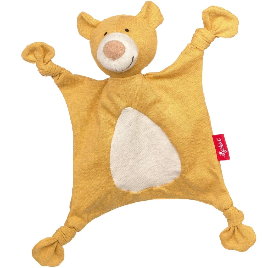 Aus reinem Bio-Baumwolljersey besteht dieses gelb/beige melierte Schnuffeltuch Bär, das durch sein leichtes Material extra anschmiegsam wird. Schnuffeltücher sind eben ein ganz besonderes Stückchen Stoff für junge Babys zum Kuscheln, Nuckeln und Trösten, wann immer sie nicht den Kontakt zu Mama oder Papa spüren.